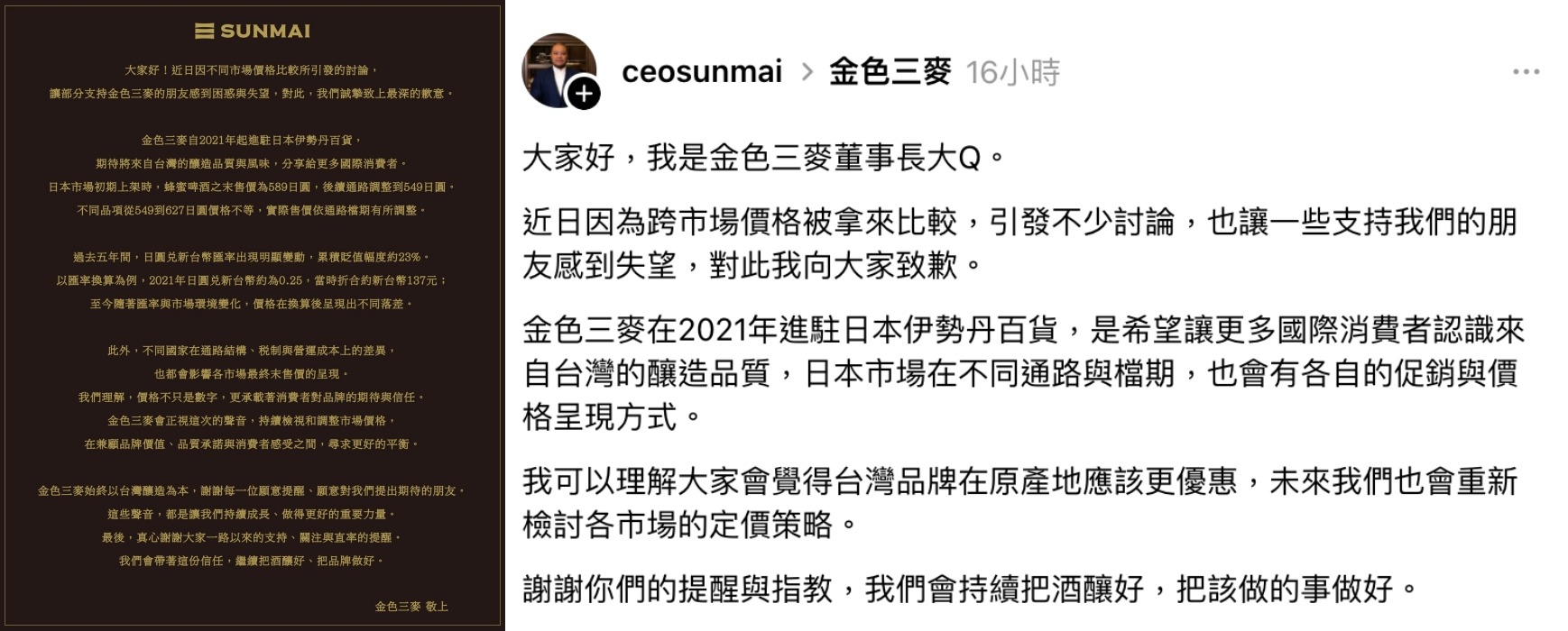 台灣知名精釀啤酒品牌「金色三麥」(SUNMAI)近日因經典產品「蜂蜜啤酒」在台、日兩地定價不一,引發「坑殺自家人」的輿論風暴。董事長葉冠廷(大Q)連日親上火線說明,並於昨(6)日深夜再度發表致歉聲明,強調品牌重視台灣消費者的情感,並正式宣布將暫時停止在台灣便利商店通路販售該款爭議產品,以展現檢討定價結構的誠意。