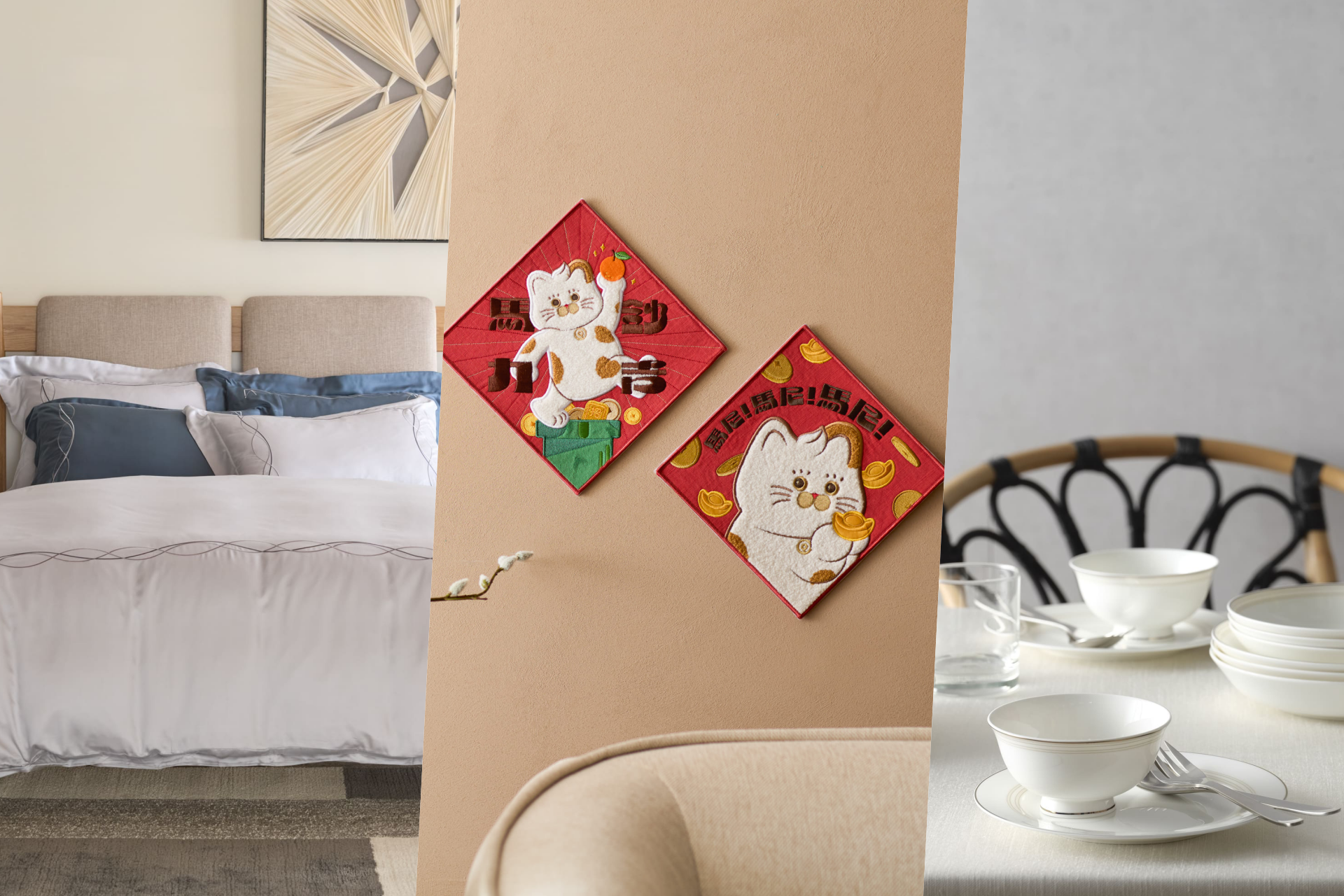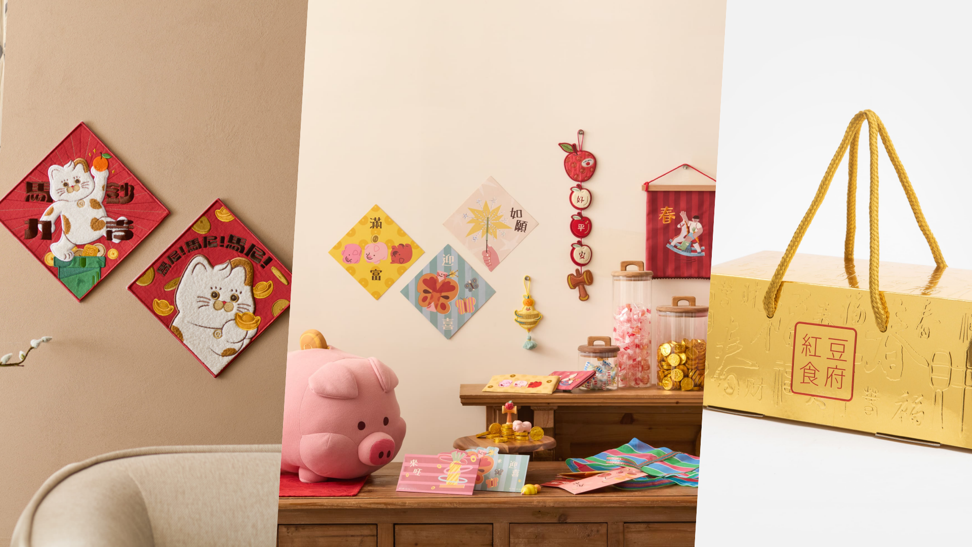最後的開運關鍵,莫過於年味佈置與走春贈禮。今年話題最高的新春小物首推「發福體刺繡斗方」,在財位貼上「Money馬尼招財貓」以及「鈔吉馬力招財貓」為新年招來好運氣,系列字體使用獲得德國紅點設計大獎的「發福體」,象徵大發大福,以圓潤富足的線條打破傳統春聯的陳規。同時,HOLA也與插畫家藝術家朱緹dee chu跨界聯名,以經典童玩為主題,將回憶中的劍玉、搖搖馬、小豬撲滿轉化為精緻斗方、掛飾、紅包等節慶飾品,讓家中的角落充滿童趣。在拜訪親友之際,帶上銷售冠軍「紅豆食府原味蛋捲金磚小提盒」或全新推出的「紅豆食府烏骨滴雞精」,不僅送禮有面子,更象徵將福氣與心意同步分享,優雅完成最後一塊過年拼圖。