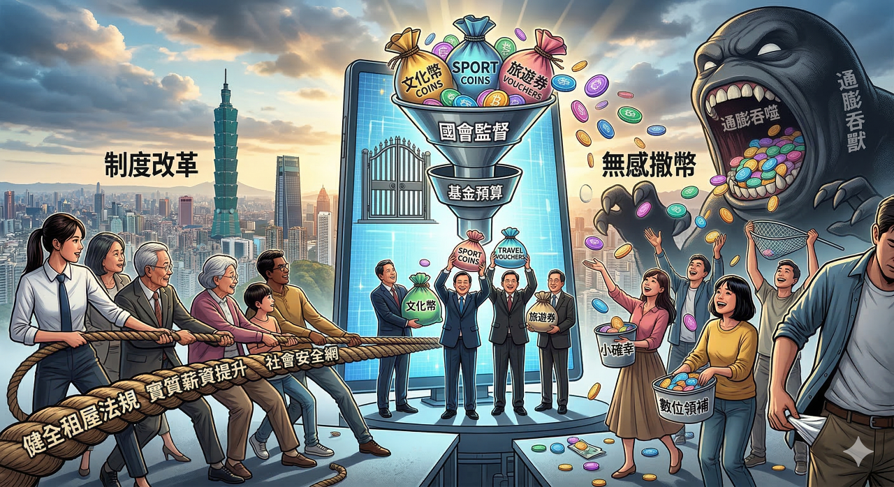 2026 年的台灣正處於十字路口:我們要繼續沈溺在這種由數位代幣編織的財政幻覺中,還是要求政府回歸法制,將預算投入到真正能改變結構的制度建設?當領錢領到「無感」時,正是人民該清醒過來,質問這場三兆元大戲背後代價的時候。