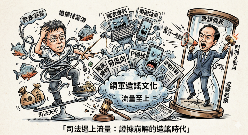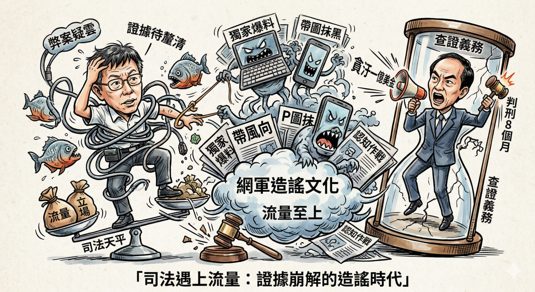 當前台灣司法正面臨一場前所未有的信譽風暴,一邊是美麗島電子報董事長吳子嘉因疫苗指控被判刑定讞,另一邊則是柯文哲案引發的程序與實體正義之爭,中間更夾雜著足以左右輿論的網軍文化。這三者的交織,勾勒出一幅荒謬的景象,在追求真相的道路上,證據往往敵不過立場,司法則在政治與流量的夾縫中舉步維艱。