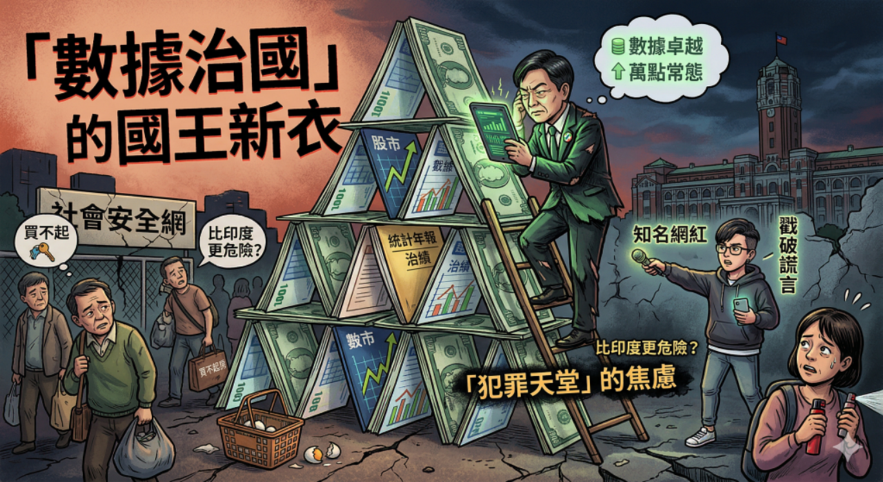 當民進黨政府治下的台灣,在數據上成了比印度還危險的「犯罪天堂」,這場荒謬劇演到這裡,已經不只是統計學的笑話,更是執政者與現實徹底脫節的悲歌。知名網紅搖頭嘆息,戳破了那層國王的新衣,政府引以為傲的「數據」,正成為他們傲慢的遮羞布。