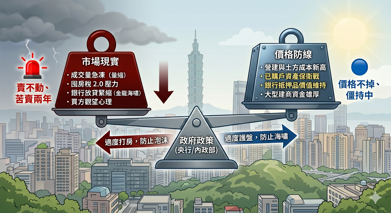 2026 年台灣房市出現了極端分化的景象。一方面有媒體報導「建商哭了」、「新案苦賣兩年」的慘澹標題充斥媒體;另一方面,實價登錄的開價依然穩如泰山。這種「賣不掉卻不降價」的現象,常被民眾詬病為違背市場邏輯。然而,深入剖析台灣房地產的金融結構後會發現,這並非單純的貪婪,而是一場誰也賠不起的「信用保衛戰」。