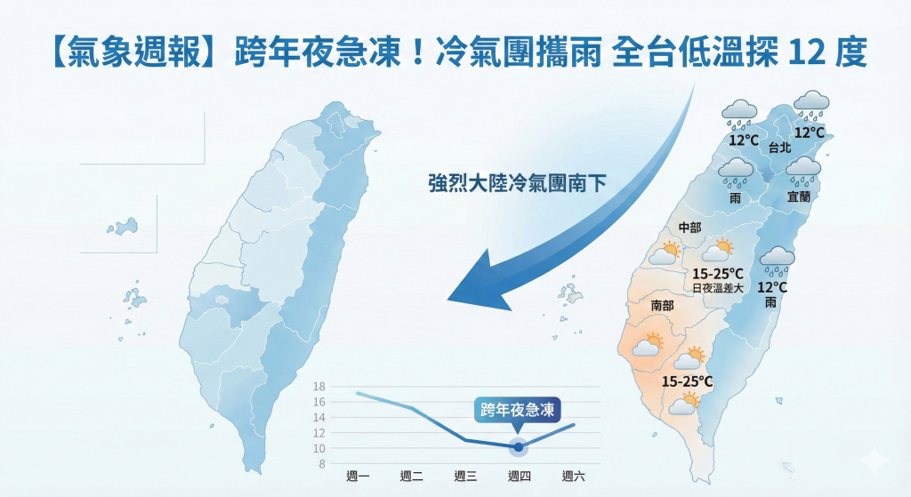 揮別 2025 年,迎接 2026 年的最後一週,全台民眾請注意保暖!中央氣象署表示,本週天氣猶如「溜滑梯」,週一、週二受東北季風…